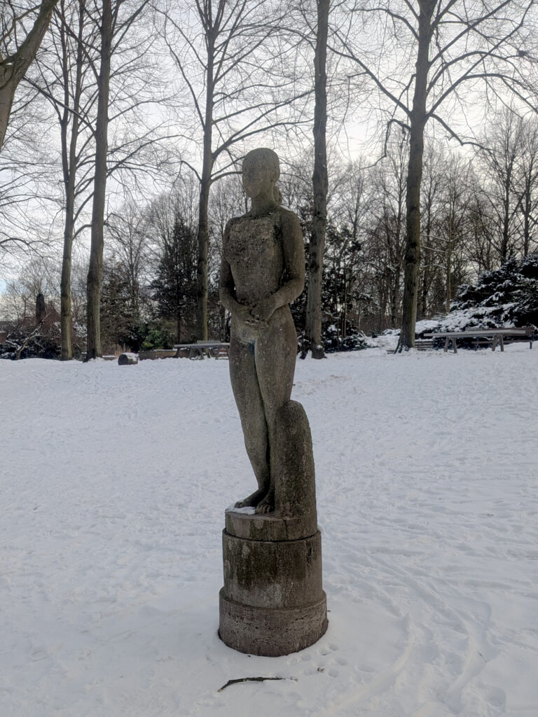 Die Skulptur „Eva mit Schal“ (auch bekannt als „Frau mit Schal“) ist die verschwundene Schwester der „Frühlingsgöttin“. Sie stand einst im Heckengarten des Hammer Parkes.